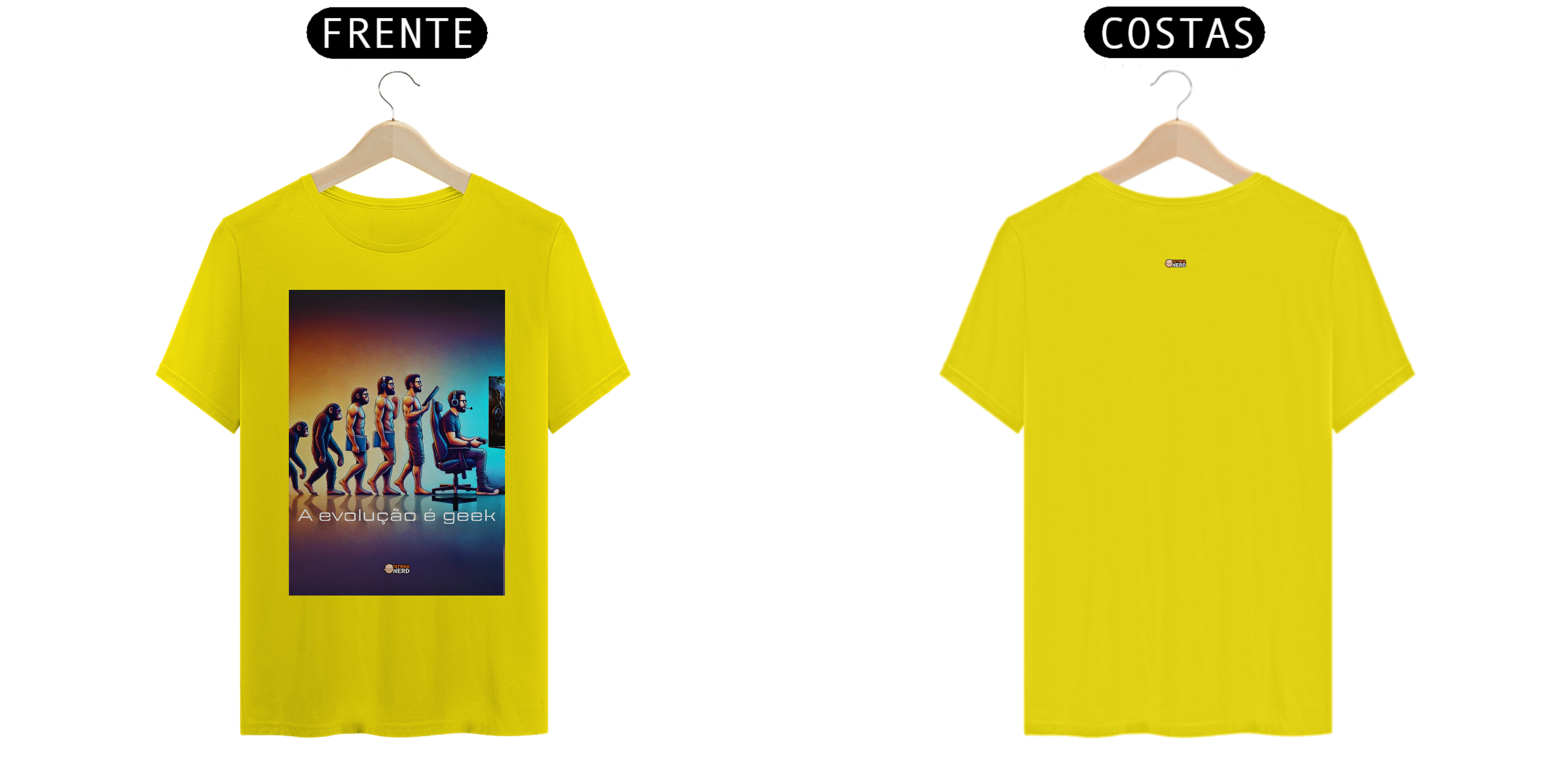 O design é detalhado e colorido, destacando cada estágio dessa transformação com elementos que remetem à cultura geek e tecnológica, como óculos, tablets e dispositivos modernos. A frase "A Evolução é Geek" complementa a arte, deixando claro que a tecnologia e a criatividade fazem parte do futuro.