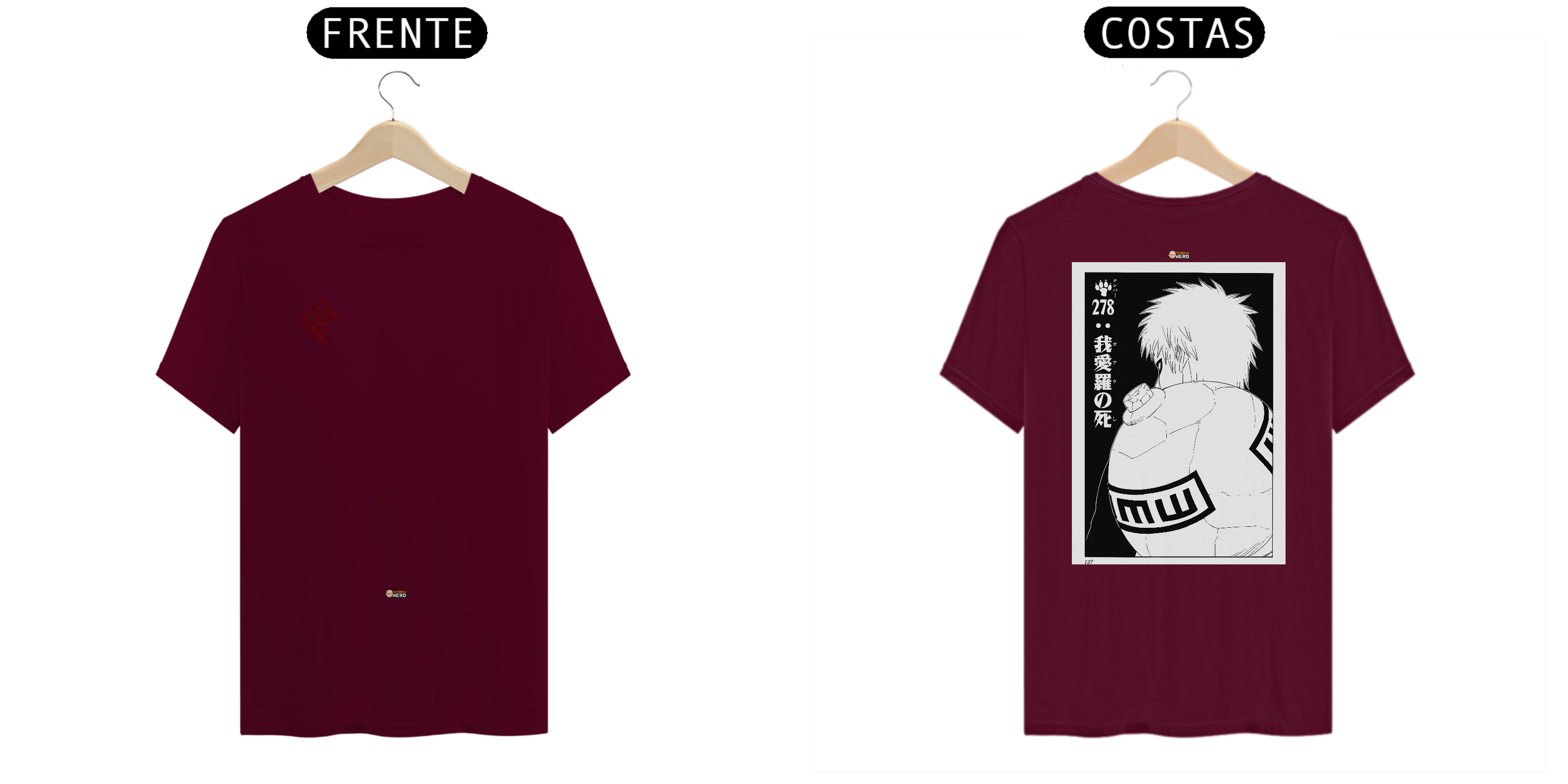 Na parte frontal, um detalhe minimalista com o kanji vermelho "愛" (Amor), símbolo tatuado na testa de Gaara, trazendo um toque discreto e cheio de significado para os fãs. Já nas costas, a estampa apresenta uma arte em estilo mangá, destacando Gaara com seu tradicional jarro de areia.