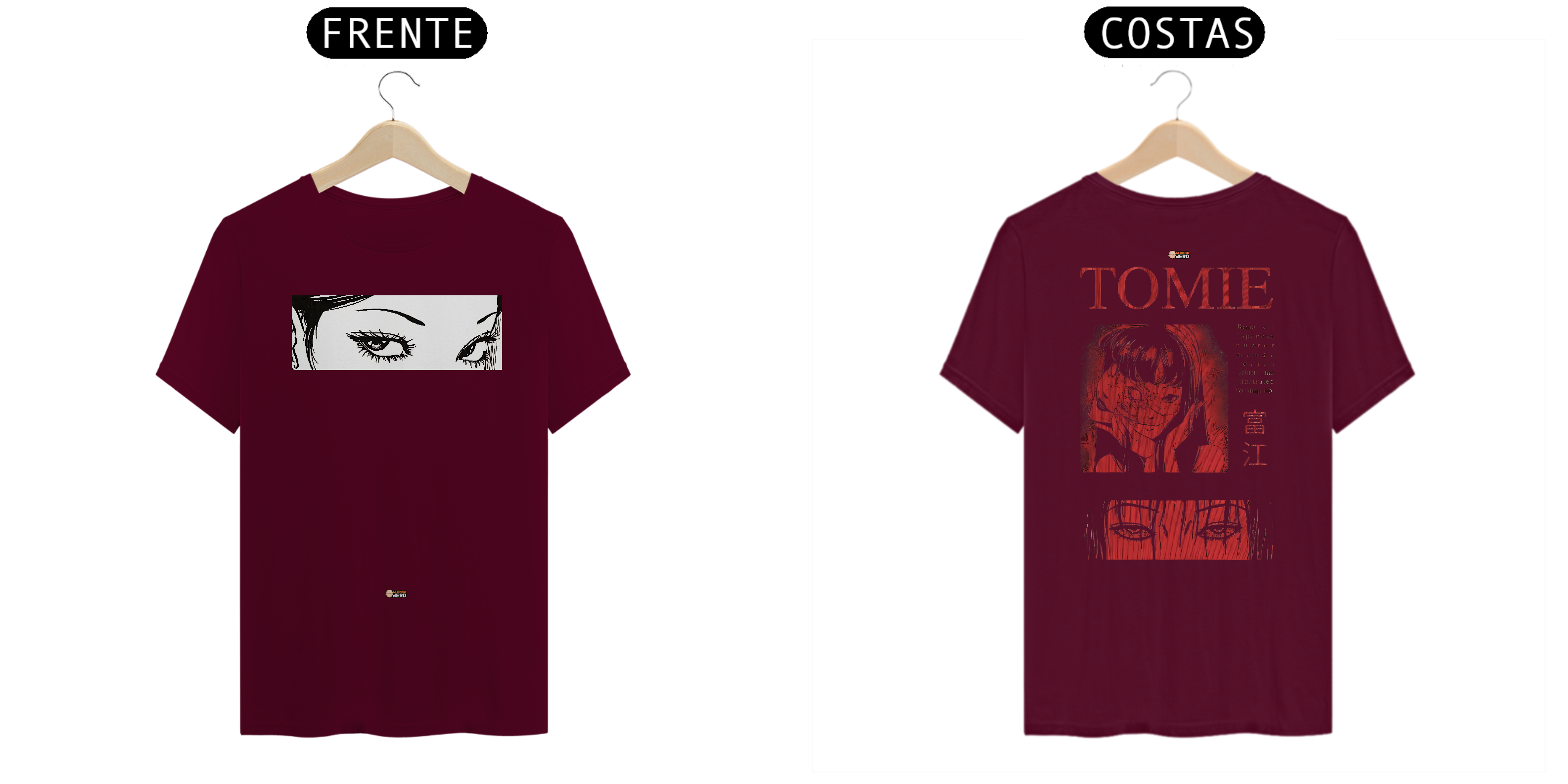 Na frente, um olhar penetrante de Tomie em estilo mangá chama atenção com um design minimalista e expressivo. Nas costas, uma ilustração detalhada com elementos do mangá, incluindo a personagem e símbolos japoneses, em tons de vermelho e preto, garantindo um visual marcante e cheio de personalidade.